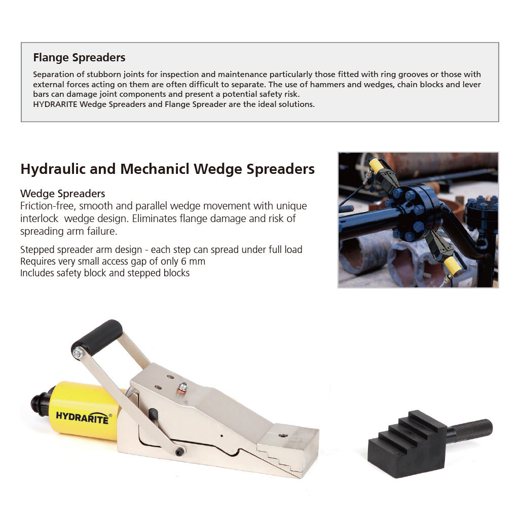 Separation of stubborn joints for inspection and maintenance particularly those fitted with ring grooves or those withexternal forces acting on them are often difficult to separate. The use of hammers and wedges, chain blocks and leverbars can damage ioint components and present a potential safety risk.HYDRARITE Wedge Spreaders and Flange Spreader are the ideal solutions.
